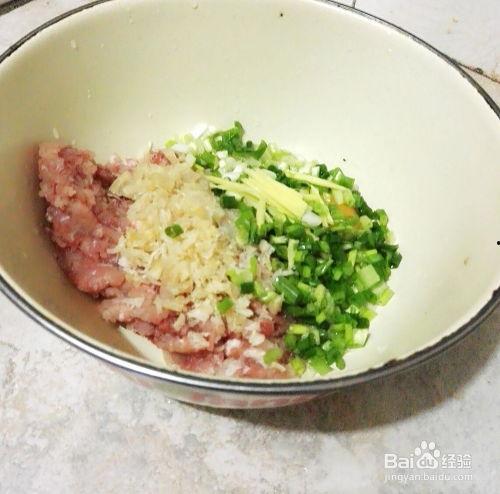 2. 准备馅料:将猪肉馅放入碗中,加入酱油、葱花、生姜、鸡精、盐、香油和鸡蛋,搅拌均匀,腌制10分钟。